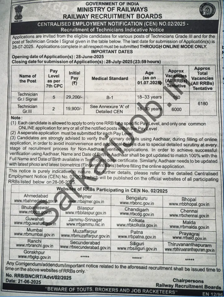 RRB Technician Recruitment Notification: The Railway Recruitment Board (RRB) has released the notification for the recruitment of 180 Technician Grade-I Signal and 6000 Technician Grade-III. The RRB Notification number CEN 02/2025 has been released in the 21-27 June 2025 employment newspaper. The online applications are invited from 28 June to 28 July 2025. All the details related to the RRB Technician Notification 2025 has been given below.